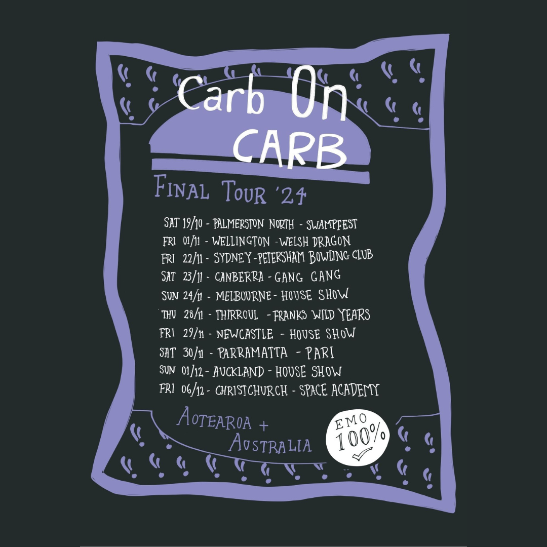 As announced on social media in August, the currently Whanganui-based two-piece are ending the band after 12 years of touring and 3 albums. Known for being advocates of DIY emo-punk on both sides of the Tasman, Carb on Carb will take to the air and road for one more run – their 17th of NZ and 15th of Australia!