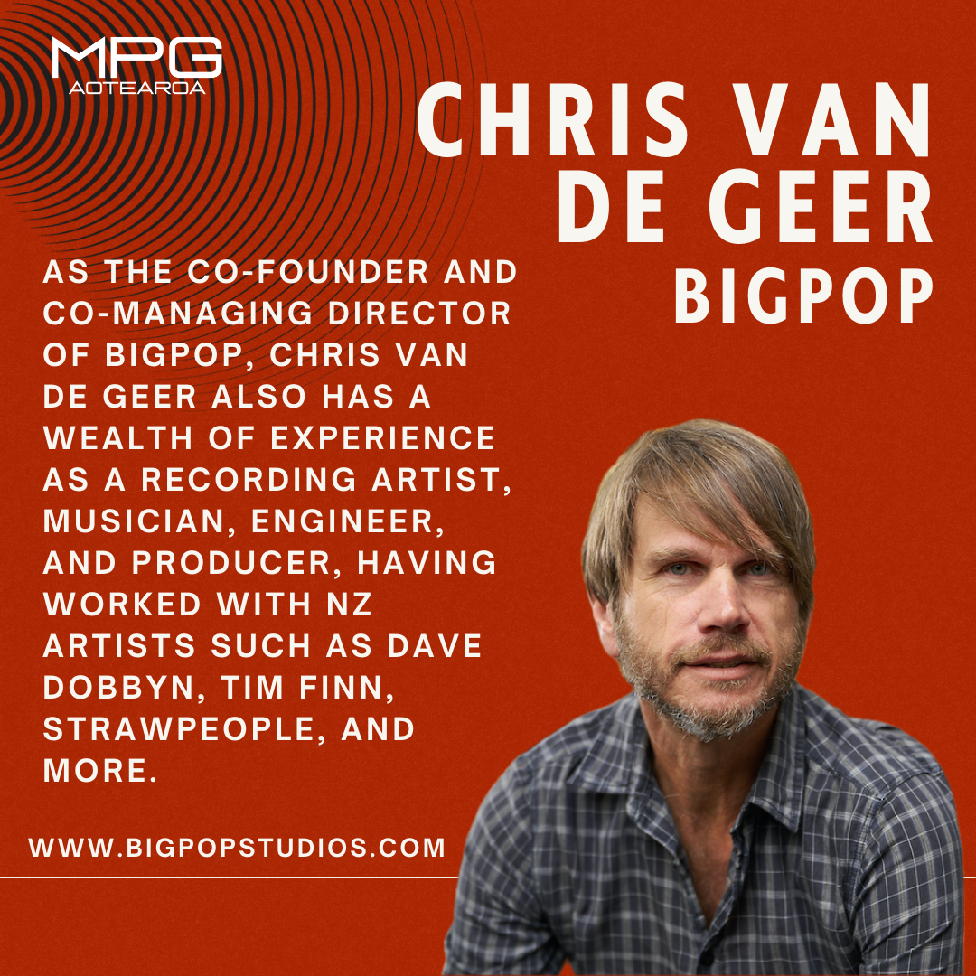 Chris van de Geer is a recording artist, musician, engineer, record producer and music business owner with 30 years experience in the Aotearoa music industry. As the co-founder and co-managing director of Bigpop, Chris has extensive knowledge and experience in music production, studio facilitation, music publishing and record label operation. Chris is a 3-time nominee and 2-time winner of both the Engineer Of The Year and Producer Of The Year categories at the Aotearoa Music Awards, having worked with NZ artists such as Dave Dobbyn, Tim Finn, Strawpeople, Garageland, Bic Runga, CHAII, and many more.