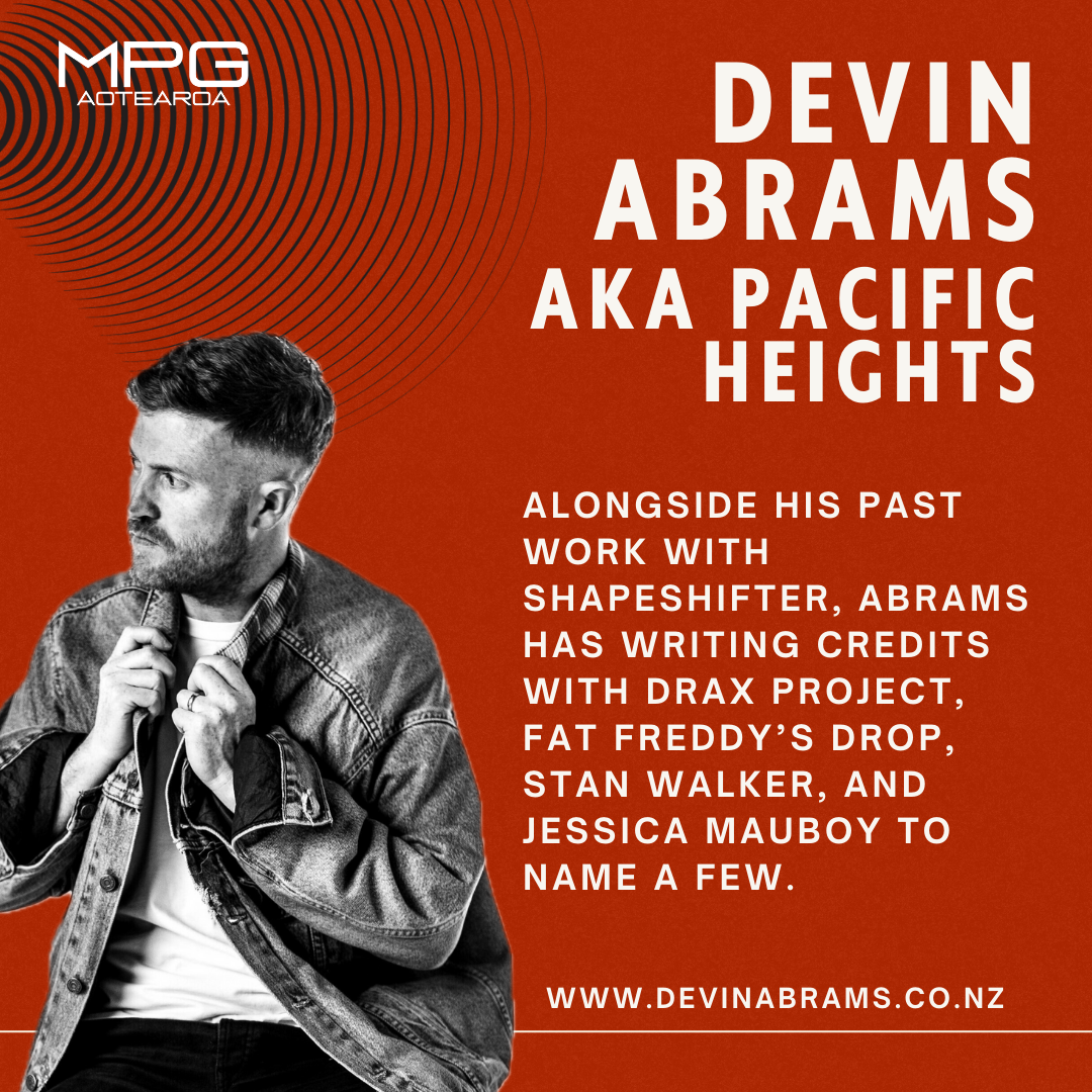With an endless number of hits, accolades and successes over the past two decades, Devin Abrams is undoubtedly one of Aotearoa’s most versatile and accomplished musicians and producers. Alongside his past work with Shapeshifter, Abrams has released a number of critically acclaimed albums under his solo project alias, Pacific Heights. Devin has worked with Drax Project from 2015 to 2019 including their smash hits ‘Woke Up Late’ and ‘Catching Feelings’. He’s also worked with Six60, Stan Walker, and Fat Freddy’s Drop’s Dallas Tamaira.