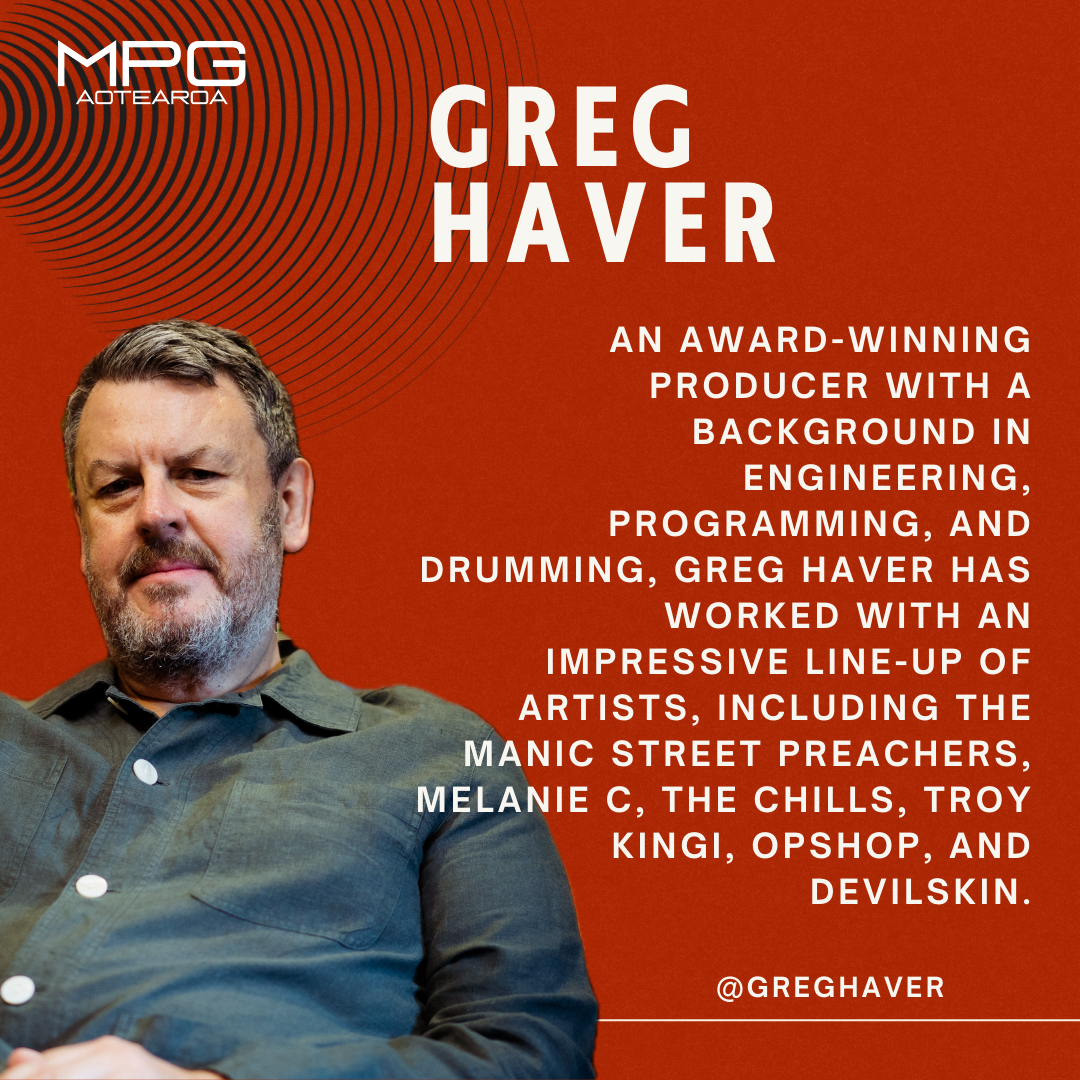 Greg Haver is an award-winning producer with a background in engineering, programming and drumming. He built his impressive reputation with artists including the Manic Street Preachers, Melanie C, INME, The Chills, Troy Kingi, Opshop, Devilskin, the Feelers, Kimbra, Catatonia, Super Furry Animals and Bullet For My Valentine. He is renowned for his diverse production skills and innovative arrangements. He’s on the Executive Committee of the Music Producers Guild Aotearoa and has been involved with setting up several industry programmes including AMPS, SyncPosium, SongHubs and NZ On Air’s New Music Development.