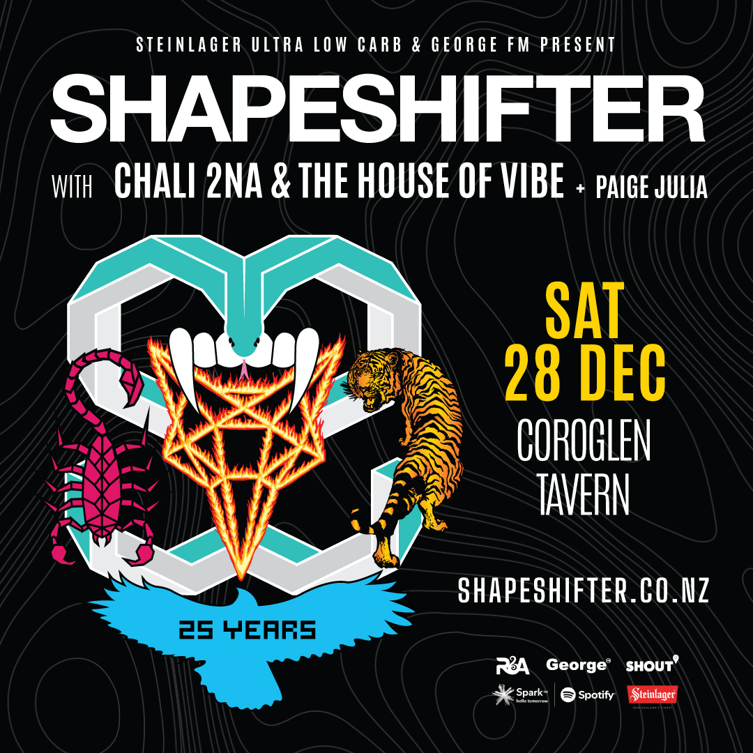 Celebrating 25 years of Shapeshifter – with support from friends Sunshine Sound System and George FM’s Sin in Havelock North and, in the Coromandel: the legendary Chali 2na (Jurassic 5, Ozomatli) with his three-piece band ‘The House Of Vibe’ accompanied by Paige Julia to warm things up.