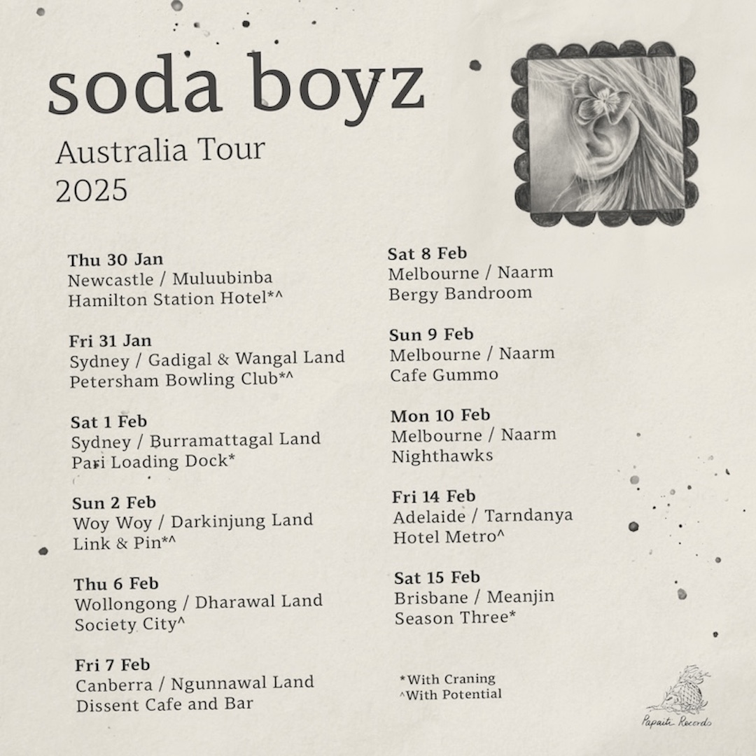 SODA BOYZ are Aotearoa’s premier proponents of slowcore, having honed their delivery to emphasize the negative space, leaving audiences hanging on every note. On this day they release their sophomore album Not Boyz Anymore. The band are currently mid-tour in Australia, with 7 shows remaining.