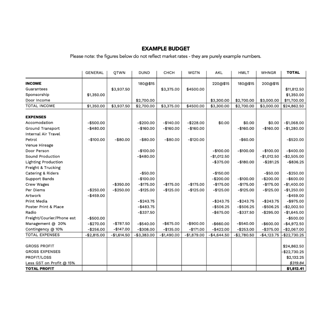 Always include at least a 10% contingency, or ‘incidentals’. This will mean you have money set aside for a blown tire, a lost bag of guitar strings or a last minute motel for a cancelled flight. Don’t bank on contingency being there at the end of the tour, but if you have some left over it makes a great bonus!